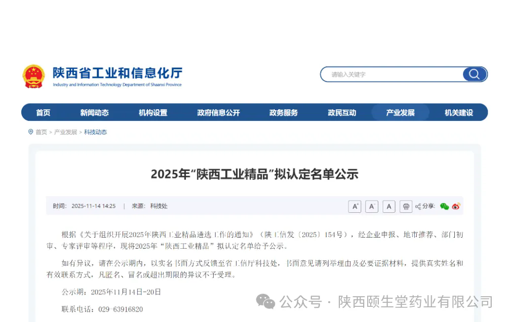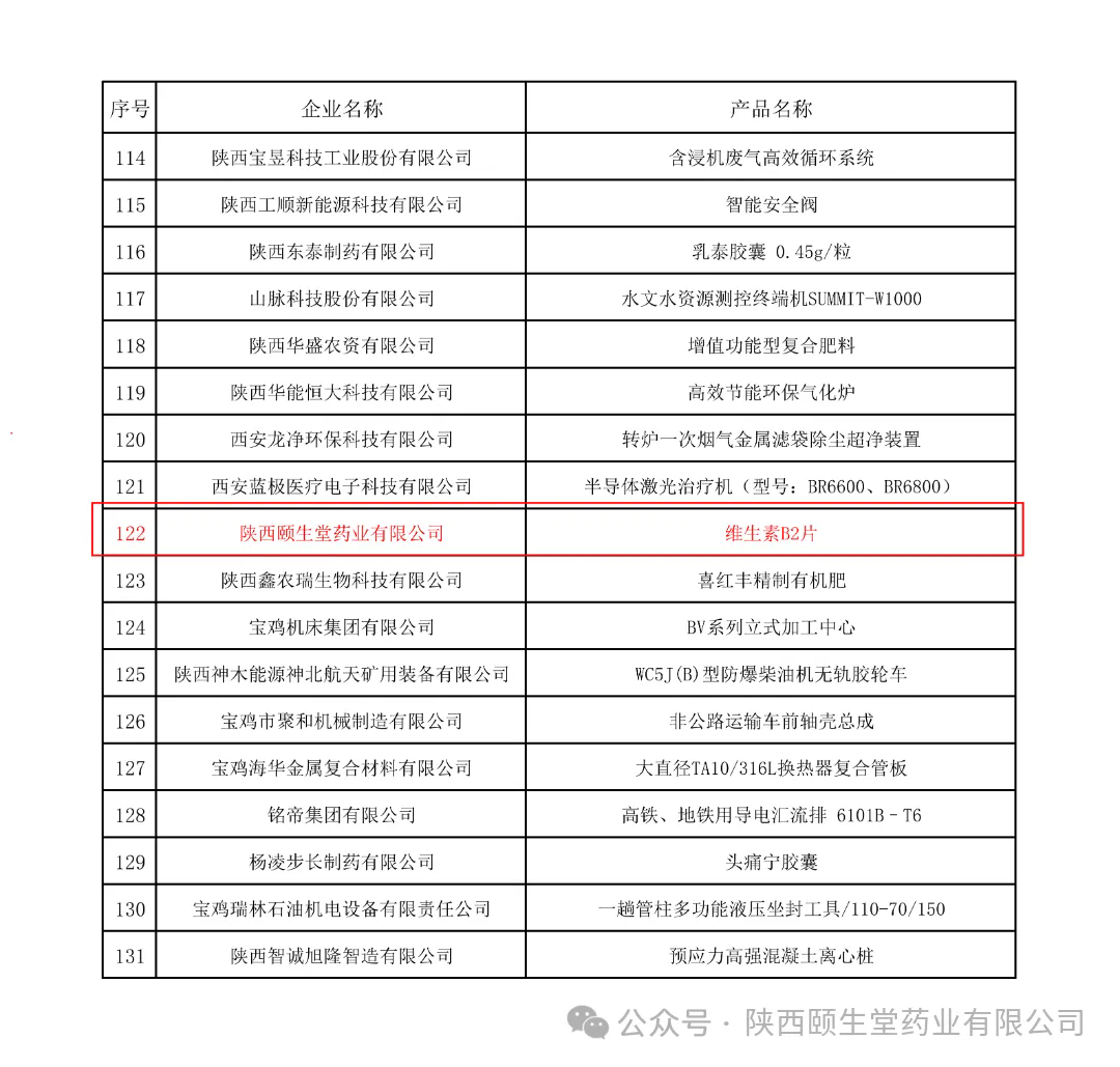 近日,陜西省工業(yè)和信息化廳正式公布2025年“陜西工業(yè)精品”名單,我公司生產(chǎn)的“維生素B2片”成功入選,這是繼“鹽酸氟桂利嗪膠囊、谷維素片”之后再度斬獲省級(jí)重要榮譽(yù)。